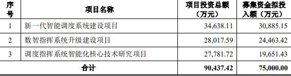 本次发行预计募集资金总额为不超过人民币75,000.00万元(含本数),扣除发行费用后拟用于新一代智能调度系统建设项目、数智指挥系统升级建设项目、调度指挥系统智能化核心技术研究项目。
