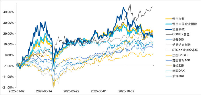 截至2025年12月15日,恒生指数全年上涨30.6%,恒生科技指数涨幅26.2%,恒生国企指数上涨25.8%,显著跑赢多数全球主流市场,用一场超预期的结构性牛市为投资者带来了惊喜。尽管2025年港股表现超预期,但不是一帆风顺,海外因素复杂,对等关税冲击,政府关门,美联储降息预期反复摇摆;国内财政货币双宽松基调,Deepseek超预期出圈,南向资金持续流入,种种因素叠加影响,港股于1-3月,7-10月走出两轮行情。回望全年港股行情,"修复"与"分化"是贯穿港股市场的两大关键词——流动性修复抬升市场估值,结构性分化则演绎出丰富的投资机会。