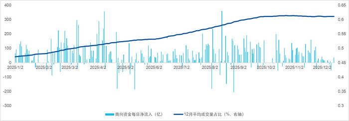 图:年初至今南向资金净流入情况及12个月平均成交量占比